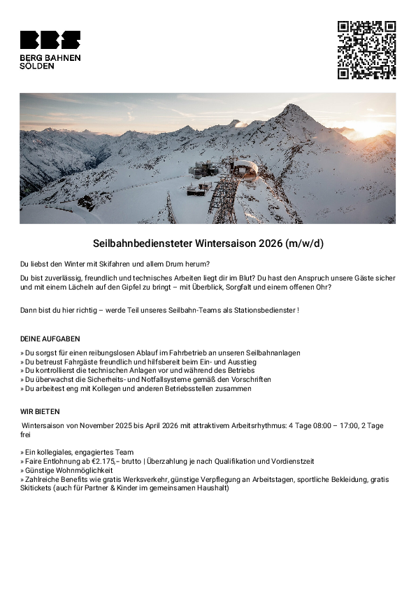 Wintersaison von November 2025 bis April 2026 mit attraktivem Arbeitsrhythmus: 4 Tage 08:00 – 17:00, 2 Tage frei