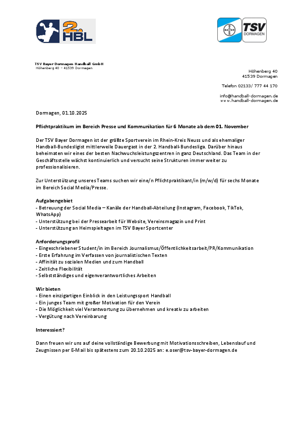 Dann freuen wir uns auf deine vollständige Bewerbung mit Motivationsschreiben, Lebenslauf und Zeugnissen per E-Mail bis spätestens zum 20.10.2025 an: e.oser@tsv-bayer-dormagen.de