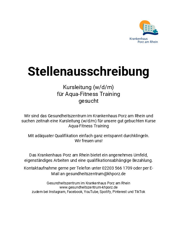 Das Gesundheitszentrum im Krankenhaus Porz am Rhein bietet jährlich mehr als 150 Kurse in Sport, Gesundheit und Prävention an - für mehr als 4.000 Teilnehmende. Für unsere Aqua Fitness Kurse suchen wir ab sofort eine qualifizierte Kursleitung.