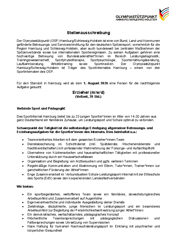 Schwerpunkt der Tätigkeit ist die selbständige Erledigung allgemeiner Betreuungs- und Erziehungsaufgaben für die Sportler*innen des Internats. Dies beinhaltet u.a.: