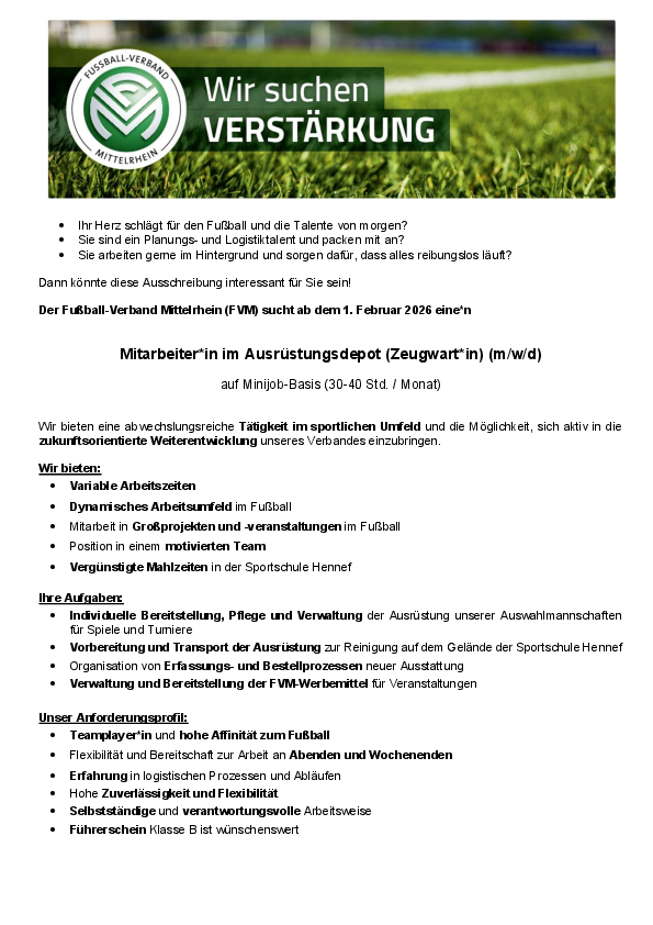 Der Fußball-Verband Mittelrhein (FVM) sucht ab dem 1. Februar 2026 eine*n
