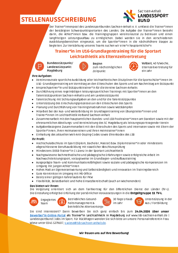 Trainer*in im u16-Grundlagentraining für die Sportart Leichtathletik als Elternzeitvertretung