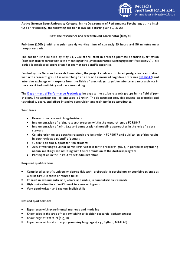 At the German Sport University Cologne, in the Department of Performance Psychology at the Institute of Psychology, the following position is available starting June 1, 2026:
