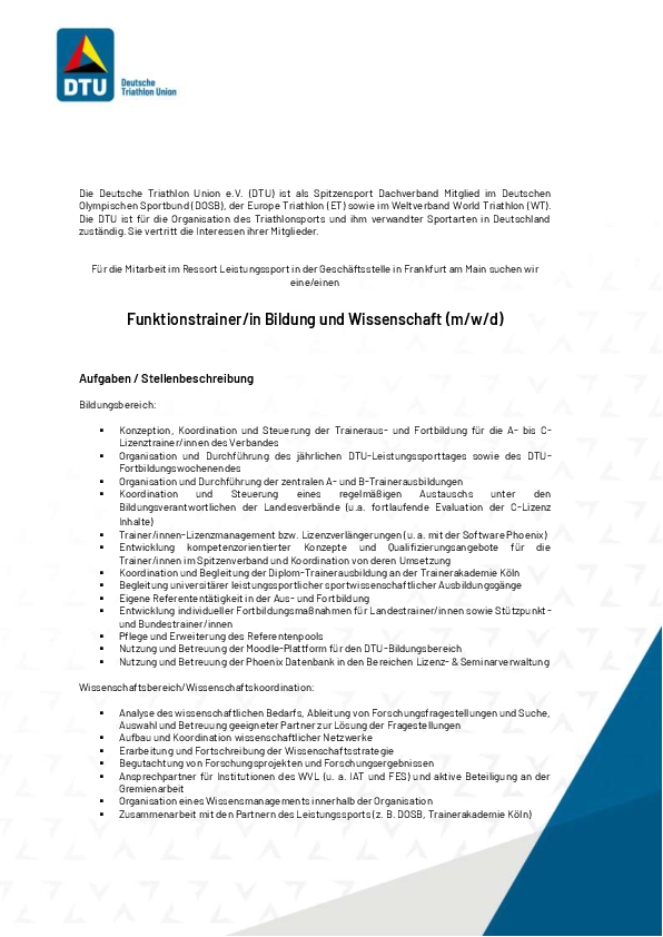 Wir bieten Ihnen ein abwechslungsreiches Aufgabengebiet mit vielen Gestaltungsmöglichkeiten in einem motivierten Arbeitsumfeld. Die Vergütung orientiert sich an der Aufgabe und den Gehaltsstrukturen für das Leistungssportpersonal der Deutschen Triathlon Union.