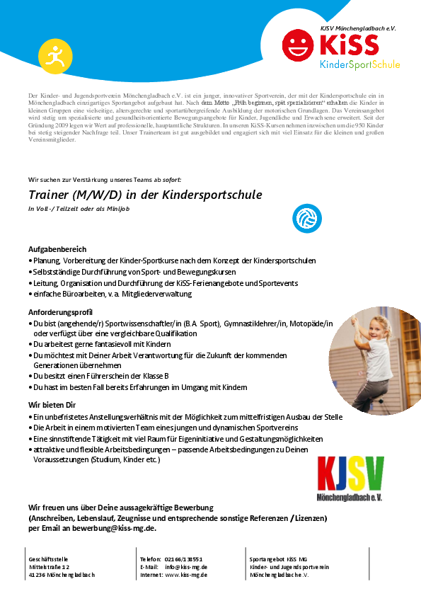 Der Kinder- und Jugendsportverein MG e.V. sucht zum nächstmöglichen Zeitpunkt Trainer/innen die es lieben Kindern sportliche Grundlagen mit auf den Lebensweg zu geben und sie so für lebenslange sportliche Aktivität zu begeistern.