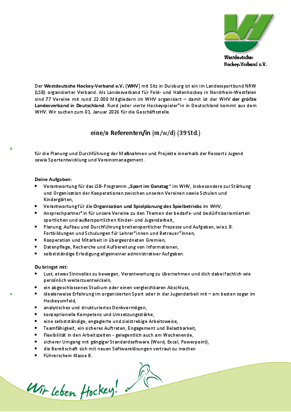 Wenn du Lust hast, den Hockeysport in NRW aktiv mitzugestalten, freuen wir uns auf deine aussagekräftige Bewerbung – mit Angabe deiner Gehaltsvorstellung und deines frühestmöglichen Eintrittstermins – bis spätestens 16. November 2025 an: