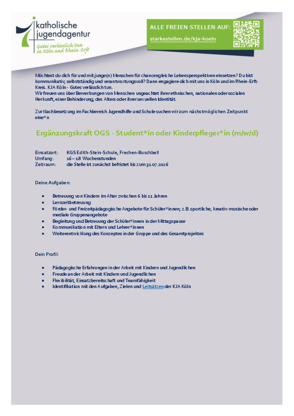 - Ergänzungskraft OGS - Student*in oder Kinderpfleger*in (m/w/d) für Grundschule in Köln-Ehrenfeld
