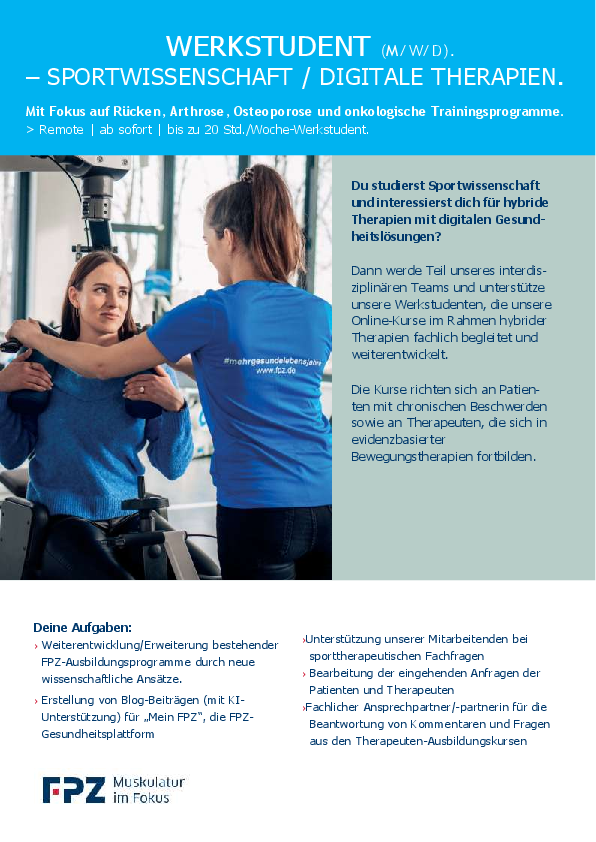 •die Weiterentwicklung/Erweiterung bestehender FPZ-Ausbildungsprogramme durch neue wissenschaftliche Ansätze. Dazu gehört die Überarbeitung bestehender Ausbildungsprogramme für Therapeuten (Rücken, Hüfte/Knie, Osteoporose, Long-Covid, Krebs) und Unterstützung des Teams bei der Konzeption der Ausbildungsprogramme zu den neuen Indikationen (Neuro-degenerative Erkrankungen)