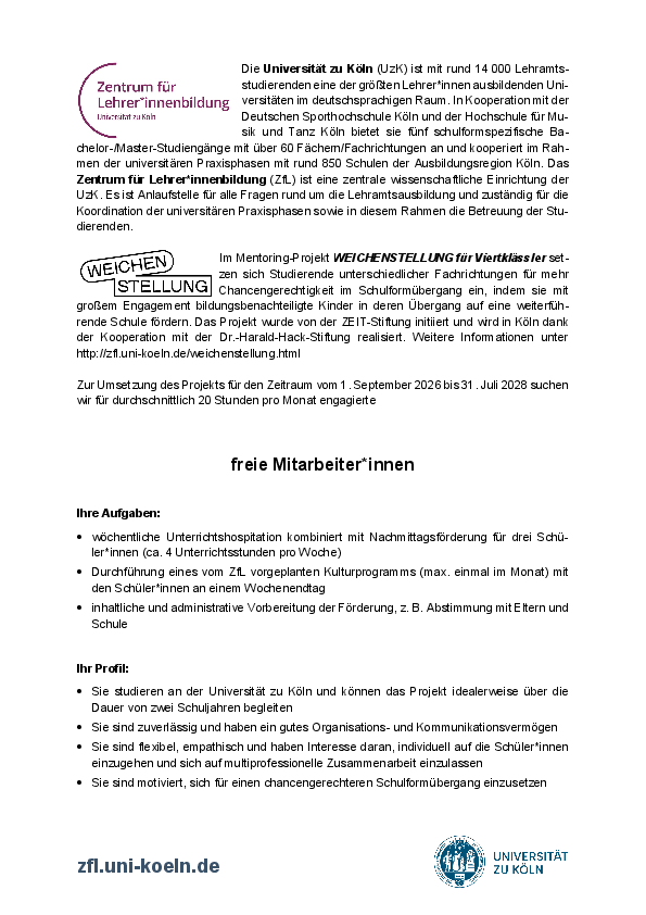Die Universität zu Köln (UzK) ist mit rund 14 000 Lehramtsstudierenden eine der größten Lehrer*innen ausbildenden Universitäten im deutschsprachigen Raum. In Kooperation mit der Deutschen Sporthochschule Köln und der Hochschule für Musik und Tanz Köln bietet sie fünf schulformspezifische Bachelor-/Master-Studiengänge mit über 60 Fächern/Fachrichtungen an und kooperiert im Rahmen der universitären Praxisphasen mit rund 850 Schulen der Aus-bildungsregion Köln. Das Zentrum für Lehrer*innenbildung (ZfL) ist eine zentrale wissen-schaftliche Einrichtung der UzK. Es ist Anlaufstelle für alle Fragen rund um die Lehramtsaus-bildung und zuständig für die Koordination der universitären Praxisphasen sowie in diesem Rahmen die Betreuung der Studierenden.