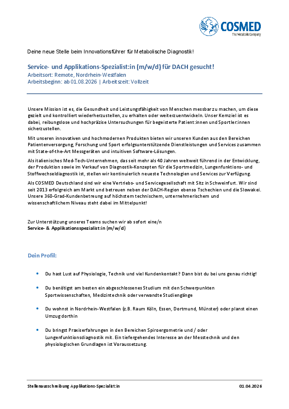 Ein abgeschlossenes Studium z. B. in Sportwissenschaft, Medizintechnik oder einem ähnlichen Bereich ist von Vorteil. Wichtig sind uns vor allem Deine Praxiserfahrung in der Diagnostik (z. B. Spiroergometrie), Dein technisches Verständnis und Deine Freude am direkten Kundenkontakt. Du bist gut organisiert, reist gerne (ca. 80 Tage im Jahr), bringst einen Führerschein sowie Englischkenntnisse mit und fühlst Dich auch bei IT-Themen nicht komplett lost. Wohnort in NRW oder Umzugsbereitschaft ist wünschenswert.