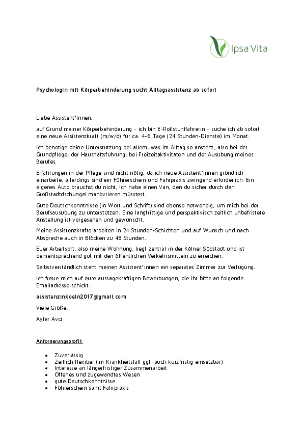 Psychologin mit Körperbehinderung sucht Alltagsassistenz ab sofort