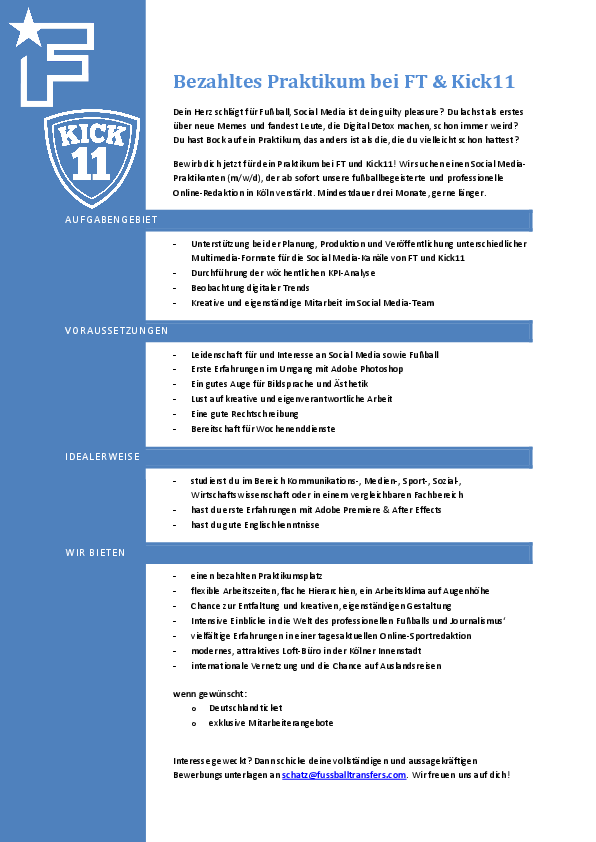 Bewirb dich jetzt für dein Praktikum bei FT und Kick11! Wir suchen einen Social Media-Praktikanten (m/w/d), der ab sofort unsere fußballbegeisterte und professionelle Online-Redaktion in Köln verstärkt. Mindestdauer drei Monate, gerne länger.