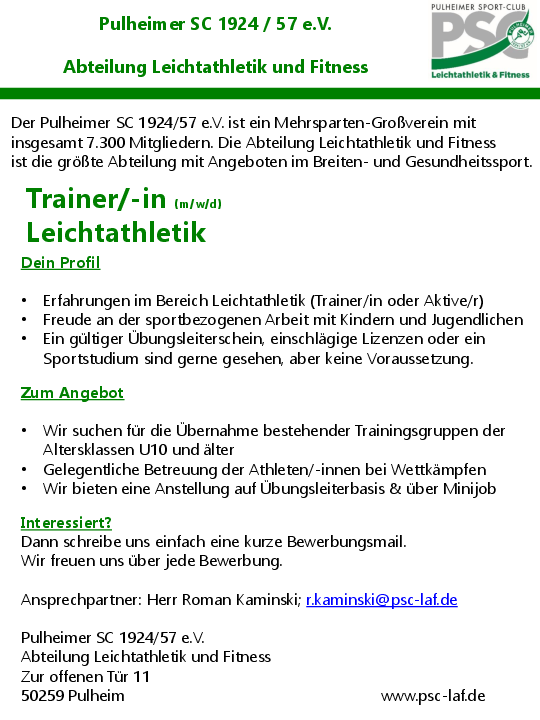 | Anbieter | Pulheimer SC 1924/57 e.V. - Abteilung Leichtathletik und Fitness |