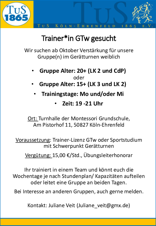 TuS Ehrenfeld sucht Trainer*in im Gerätturnen weiblich