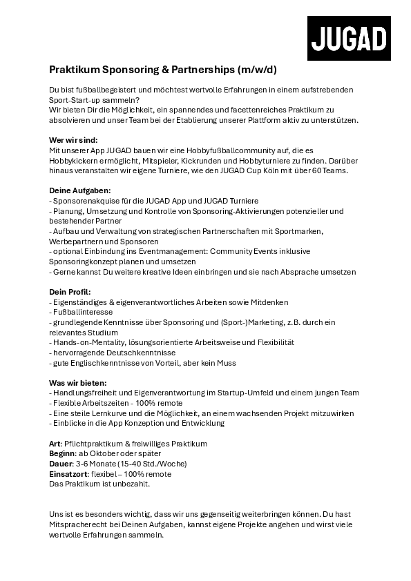 Wir freuen uns auf Deine Bewerbung mit Lebenslauf und Motivationsschreiben an: tobias.brincks@jugad.app