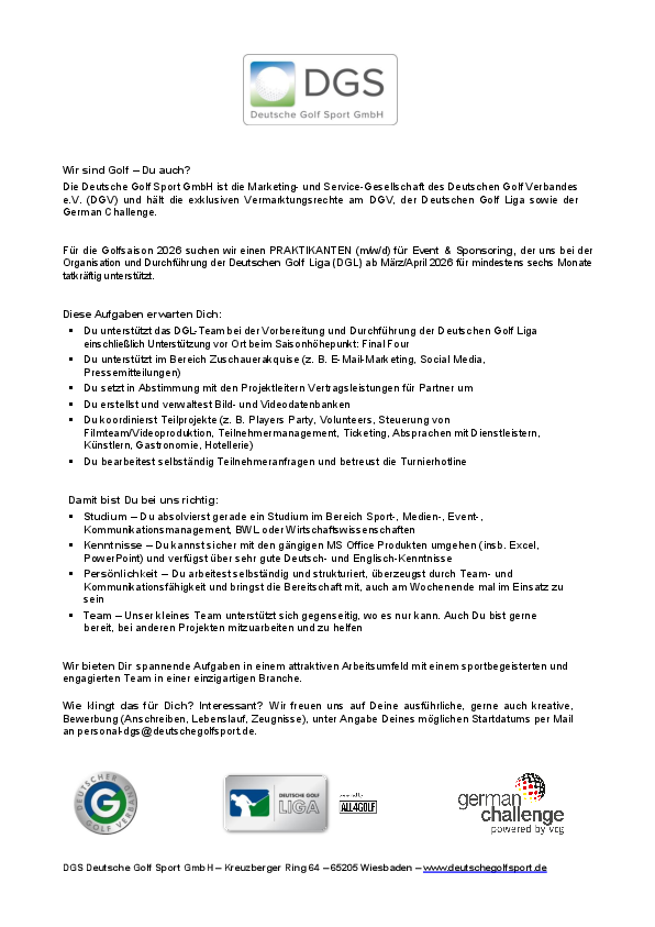 Für die Golfsaison 2026 suchen wir einen PRAKTIKANTEN (m/w/d) für Event & Sponsoring, der uns bei der Organisation und Durchführung der Deutschen Golf Liga (DGL) ab März/April 2026 für mindestens sechs Monate tatkräftig unterstützt.