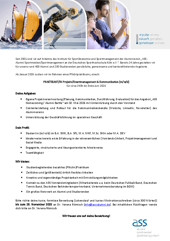 Seit 2001 sind wir auf Initiative des Instituts für Sportökonomie und Sportmanagement der Alumniverein „ASS - Alumni Sportmedien/Sportmanagement an der Deutschen Sporthochschule Köln e. V.“. Bereits 24 Jahre gestalten wir für unsere rund 400 Alumni und 200 Studierenden persönliche, gemeinsame und karrierefördernde Angebote.