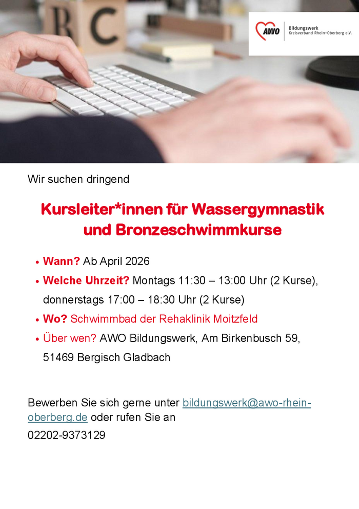 Bei Interesse gerne melden unter bildungswerk@awo-rhein-oberberg.de