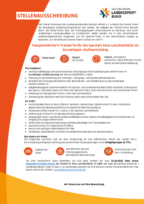 Hauptamtliche*r Trainer*in für die Sportart Para Leichtathletik im Grundlagen-/ Aufbautraining (m/w/d)