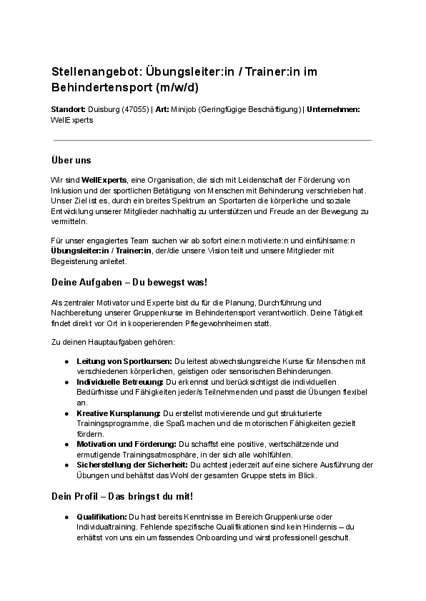 Standort: Duisburg (47055) | Art: Minijob (Geringfügige Beschäftigung) | Unternehmen: WellExperts