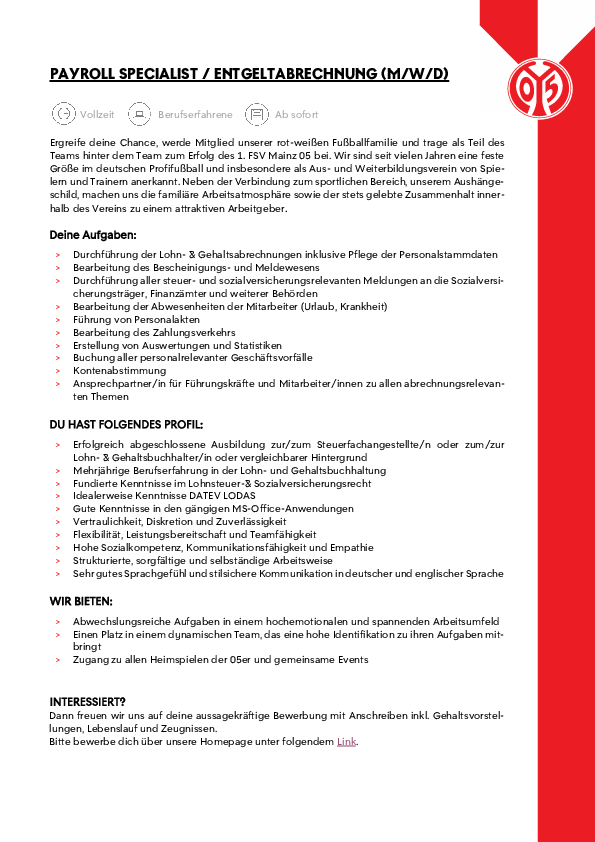 Bitte bewerbe dich über unsere Homepage unter folgendem Link: www.mainz05.de/jobs