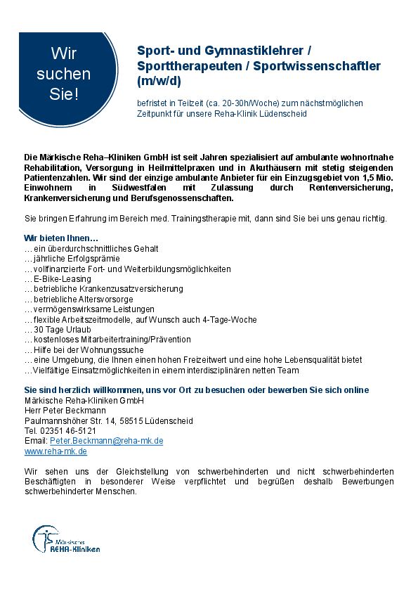 für die Reha-Klinik Lüdenscheid zum nächstmöglichen Zeitpunkt Sport- und Gymnastiklehrer (m/w/d) oder Sportwissenschaftler (m/w/d) in Voll- (40 Std./Wo.) oder Teilzeit. Wir suchen Sporttherapeuten (m/w/d) mit Berufsabschluss und angehende Sporttherapeuten (m/w/d) im Studium oder in der Berufsausbildung. Berufserfahrung ist vorteilhaft, aber nicht Bedingung.