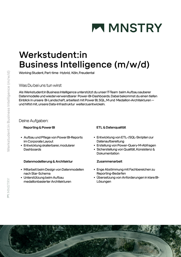 Als Werkstudent:in Business Intelligence unterstützt du unser IT-Team beim Aufbau sauberer Datenmodelle und wiederverwendbarer Power-BI-Dashboards. Dabei bekommst du einen tiefen Einblick in unsere BI-Landschaft, arbeitest mit Power BI, SQL, M und Medaillon-Architekturen – und hilfst mit, unsere Data-Infrastruktur weiterzuentwickeln.