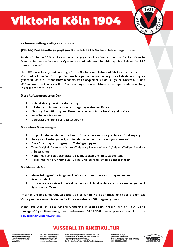 Wenn Du Dich in dem Anforderungsprofil wiederfindest, freuen wir uns auf Deine aussagekräftige Bewerbung, bis spätestens 07.11.2025, vorzugsweise per Mail an bewerbung@viktoria1904.de.