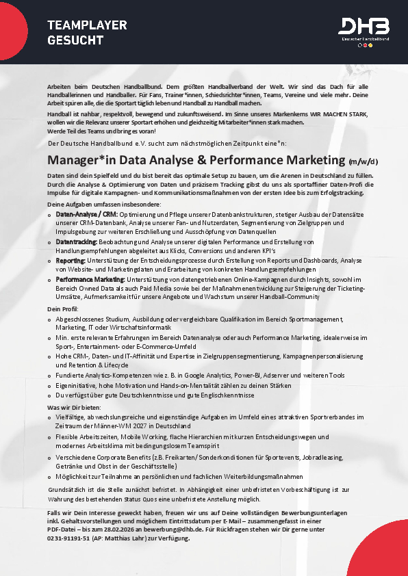 Manager*in Data Analyse & Performance Marketing (m/w/d), Deutscher Handballbund e.V.