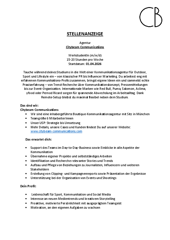PR WerkstudentIn bei Citybeam Communications(m/w/d)