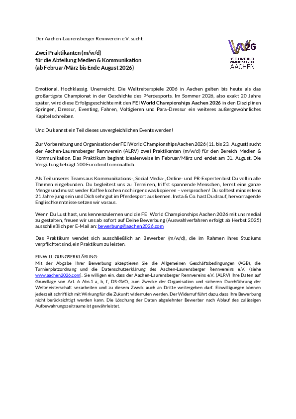 Zur Vorbereitung und Organisation der FEI World Championships Aachen 2026 (11. bis 23. August) sucht der Aachen-Laurensberger Rennverein (ALRV) zwei Praktikanten (m/w/d) für den Bereich Medien & Kommunikation. Das Praktikum beginnt idealerweise im Februar/März und endet am 31. August. Die Vergütung beträgt 500 Euro brutto monatlich.