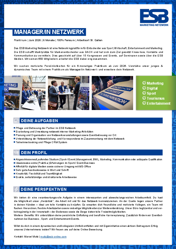 | Branchen | Sportvereine und Sportverbände Sportmarketing, Sportmanagement und Sportsponsoring Sport PR, Medien und Sportjournalismus |