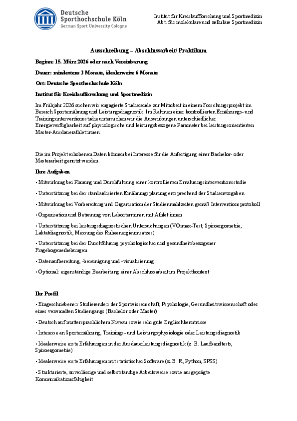 Ausschreibung – Praktikum / Bachelor- oder Masterarbeit am Institut für Kreislaufforschung und Sportmedizin