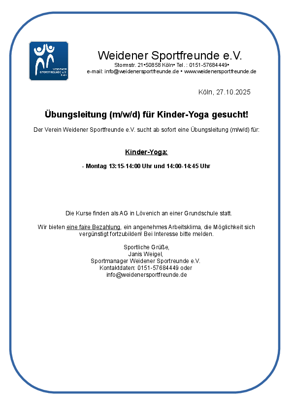 Der Verein Weidener Sportfreunde e.V. sucht ab sofort eine Übungsleitung (m/w/d) für: