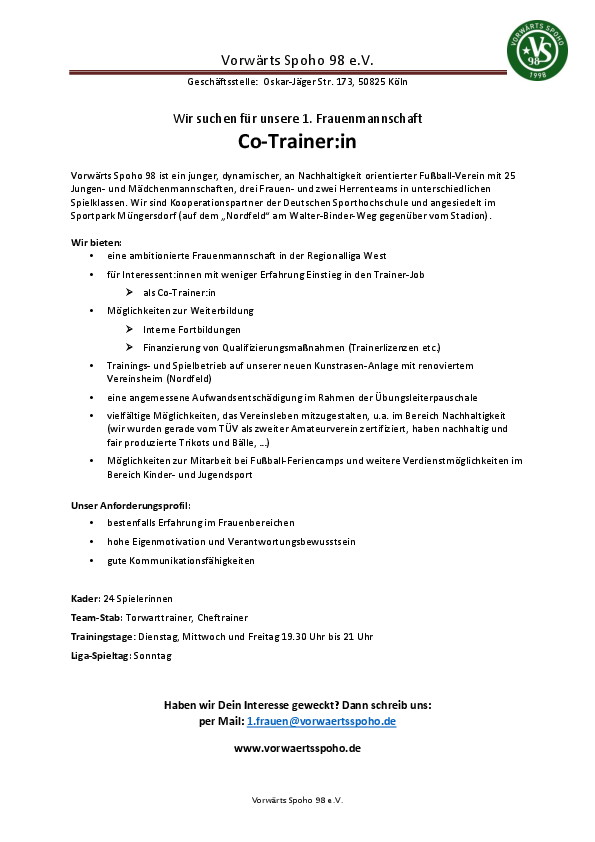 1. Frauenmannschaft von Vorwärts Spoho 98 sucht eine:n Co-Trainer:in ab sofort! (m/w/d)