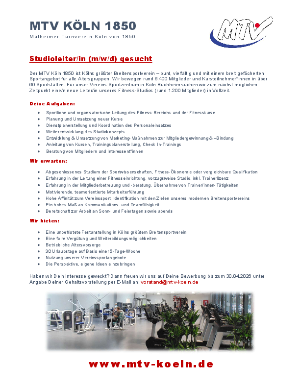 Der MTV Köln 1850 ist Kölns größter Breitensportverein – bunt, vielfältig und mit einem breit gefächerten Sportangebot für alle Altersgruppen. Wir bewegen rund 6.400 Mitglieder und Kursteilnehmer*innen in über 60 Sportstätten. Für unser Vereins-Sportzentrum in Köln-Buchheim suchen wir zum nächst möglichen Zeitpunkt eine/n neue Leiter/in unseres Fitness-Studios mit rund 1.200 Mitgliedern in Vollzeit (unbefristet).