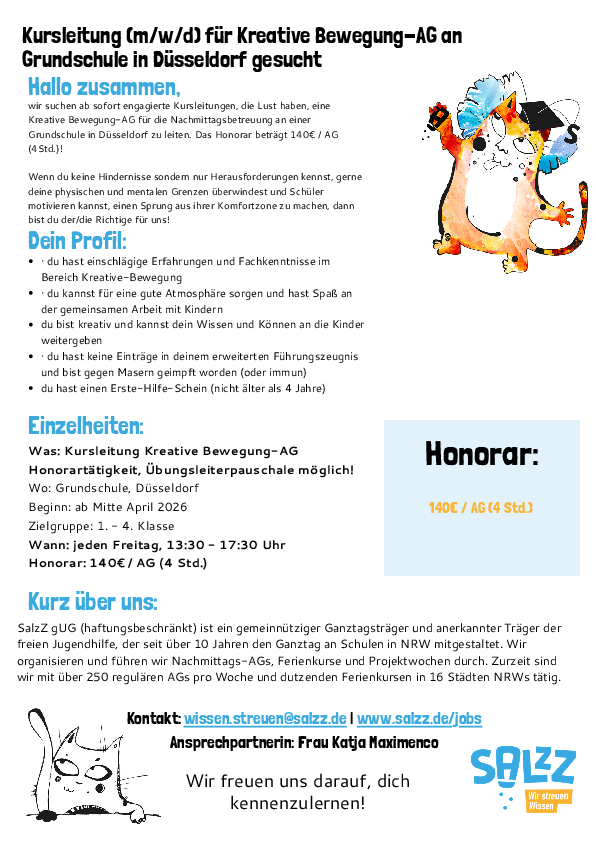 Wir suchen ab sofort engagierte Kursleitungen (m/w/d) für eine Kreative Bewegung-AG an einer Schule in Düsseldorf.