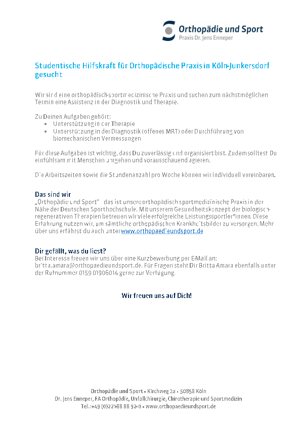 Studentische Hilfskraft für Orthopädische Praxis in Köln-Junkersdorf gesucht