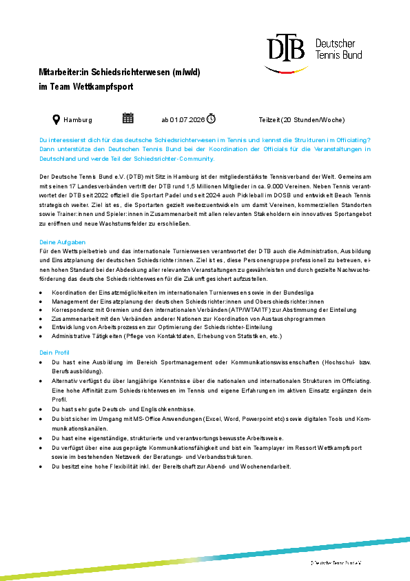 Der Deutsche Tennis Bund e.V. (DTB) mit Sitz in Hamburg ist der mitgliederstärkste Tennisverband der Welt. Gemeinsam mit seinen 17 Landesverbänden vertritt der DTB rund 1,5 Millionen Mitglieder in ca. 9.000 Vereinen. Neben Tennis verant-wortet der DTB seit 2022 offiziell die Sportart Padel und seit 2024 auch Pickleball im DOSB und entwickelt Beach Tennis strategisch weiter. Ziel ist es, die Sportarten gezielt weiterzuentwickeln um damit Vereinen, kommerziellen Standorten sowie Trainer:innen und Spieler:innen in Zusammenarbeit mit allen relevanten Stakeholdern ein innovatives Sportangebot zu eröff-nen und neue Wachstumsfelder zu erschließen.