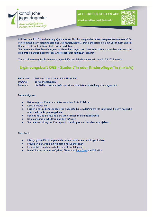 Möchtest du dich für und mit junge(n) Menschen für chancengleiche Lebensperspektiven einsetzen? Du bist kommunikativ, selbstständig und verantwortungsvoll? Dann engagiere dich mit uns in Köln und im Rhein-Erft-Kreis. KJA Köln - Gutes verlässlich tun.