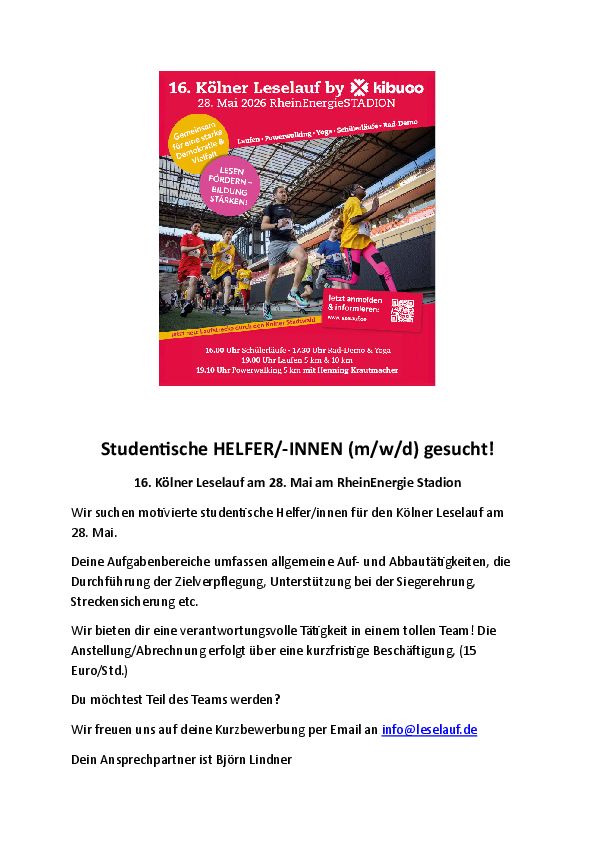 Wir bieten dir eine verantwortungsvolle Tätigkeit in einem tollen Team! Die Anstellung/Abrechnung erfolgt über eine kurzfristige Beschäftigung, (15 Euro/Std.). Weitere Infos zum Lauf findest du unter www.leselauf.de