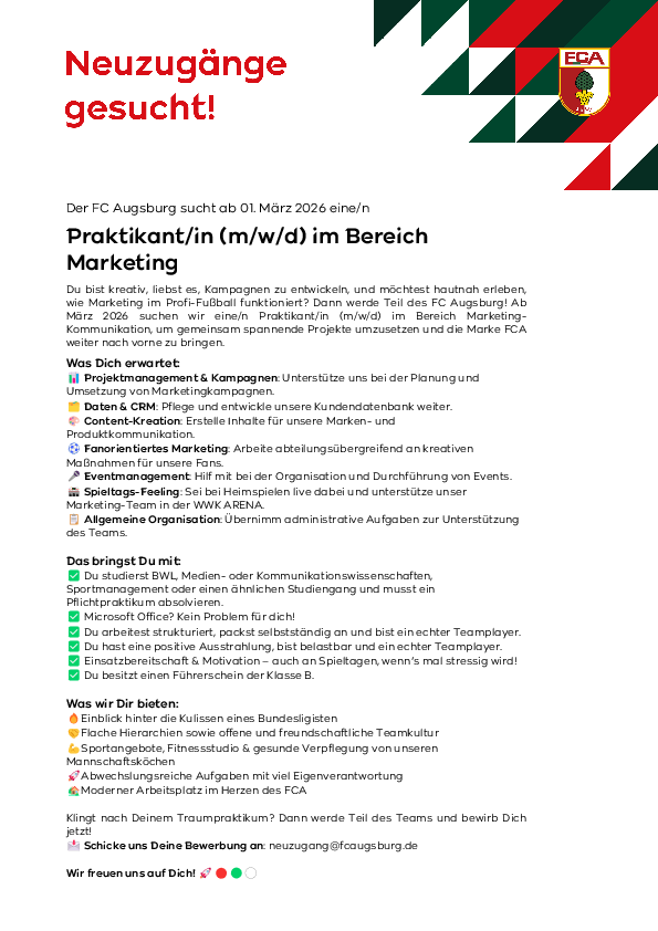 Du bist kreativ, liebst es, Kampagnen zu entwickeln, und möchtest hautnah erleben, wie Marketing im Profi-Fußball funktioniert? Dann werde Teil des FC Augsburg! Ab März 2026 suchen wir eine/n Praktikant/in (m/w/d) im Bereich Marketing-Kommunikation, um gemeinsam spannende Projekte umzusetzen und die Marke FCA weiter nach vorne zu bringen.