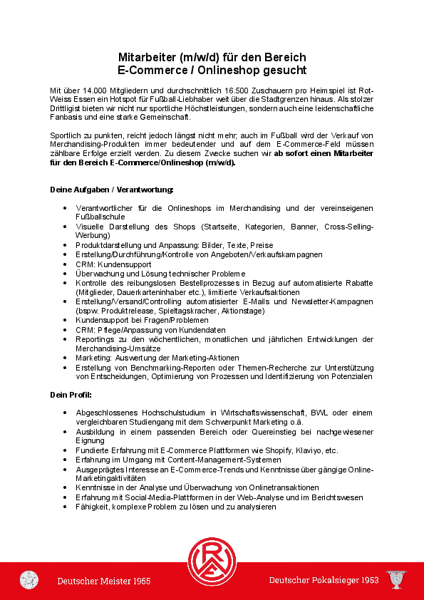 Sportlich zu punkten, reicht jedoch längst nicht mehr; auch im Fußball wird der Verkauf von Merchandising-Produkten immer bedeutender und auf dem E-Commerce-Feld müssen zählbare Erfolge erzielt werden. Zu diesem Zwecke suchen wir ab sofort einen Mitarbeiter für den Bereich E-Commerce/Onlineshop (m/w/d).