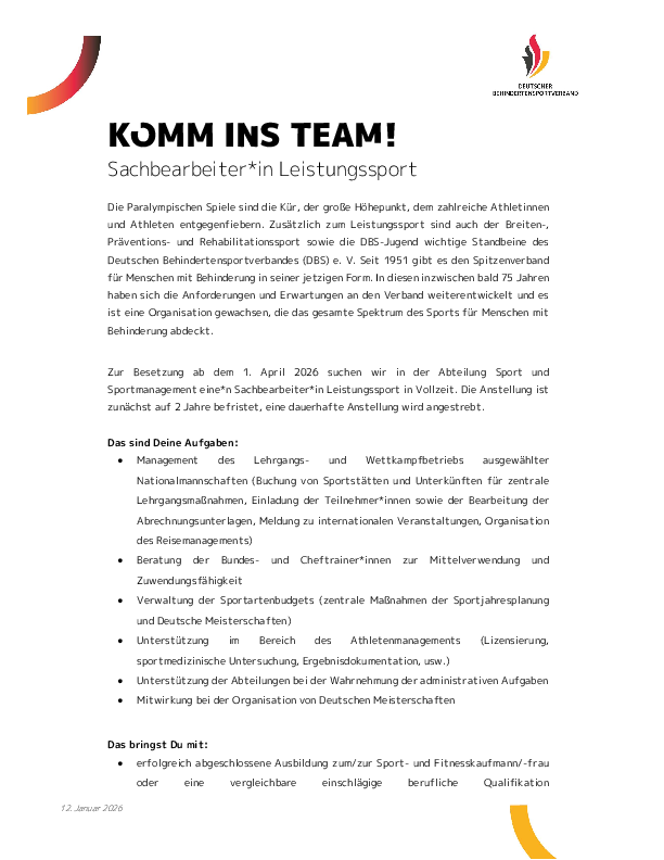 Zur Besetzung ab dem 1. April 2026 suchen wir in der Abteilung Sport und Sportmanagement eine*n Sachbearbeiter*in Leistungssport in Vollzeit. Die Anstellung ist zunächst auf 2 Jahre befristet, eine dauerhafte Anstellung wird angestrebt.