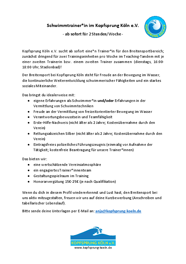 Bitte sende deine Unterlagen per E-Mail an: anja@kopfsprung-koeln.de
