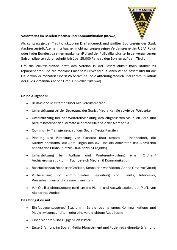 •Planung und Erstellung von Content über unsere 1. Mannschaft, die Nachwuchsteams, die Abteilungen des e.V. und die Aktivitäten der Alemannia abseits des Fußballplatzes ( u.a. soziale Projekte)