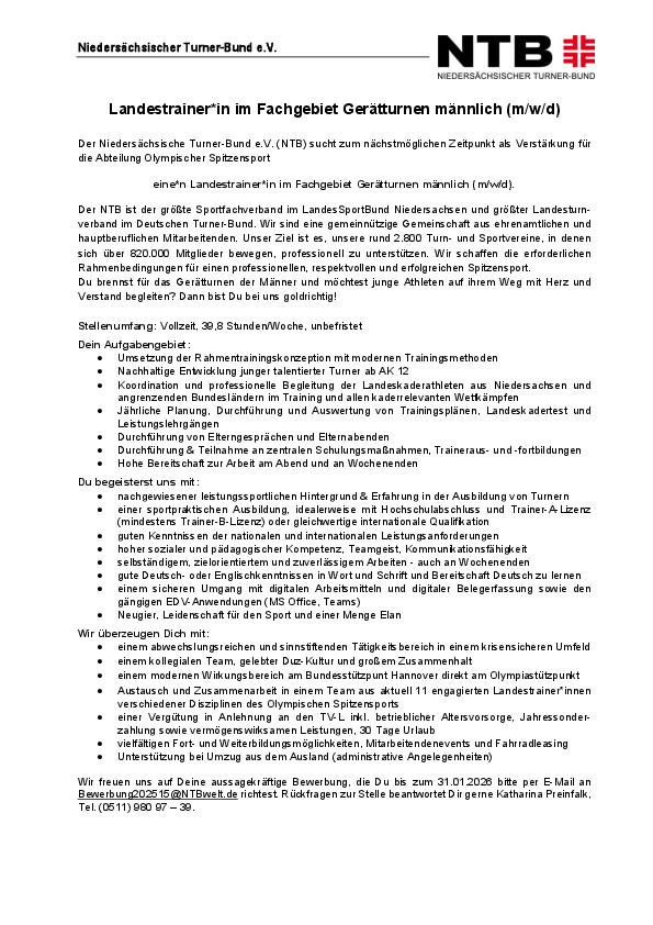 Der Niedersächsische Turner-Bund e.V. (NTB) sucht zum nächstmöglichen Zeitpunkt als Verstärkung für