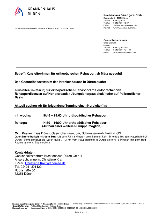 Das Gesundheitszentrum des Krankenhauses in Düren sucht: