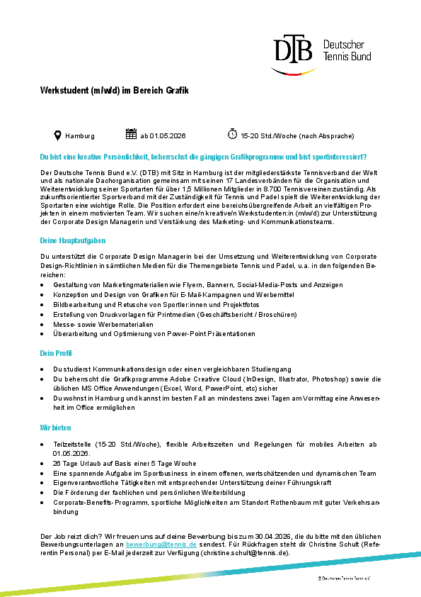 Der Deutsche Tennis Bund e.V. (DTB) mit Sitz in Hamburg ist der mitgliederstärkste Tennisverband der Welt und als nationale Dachorganisation gemeinsam mit seinen 17 Landesverbänden für die Organisation und Weiterentwicklung seiner Sportarten für über 1,5 Millionen Mitglieder in 8.700 Tennisvereinen zuständig. Als zukunftsorientierter Sportverband mit der Zuständigkeit für Tennis und Padel spielt die Weiterentwicklung der Sportarten eine wichtige Rolle. Die Position erfordert eine bereichsübergreifende Arbeit an vielfältigen Projekten in einem motivierten Team. Wir suchen eine/n kreative/n Werkstudenten:in (m/w/d) zur Unterstützung der Corporate Design Managerin und Verstärkung des Marketing- und Kommunikationsteams.