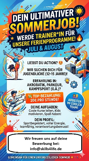 Erfahrung im Gepäck (wäre super!): Du hast Erfahrung in Bereichen wie Akrobatik, Parkour, Kampfsport oder ähnlichem? Perfekt! Aber auch wenn du "nur" sportlich bist, motiviert bist und gut mit Jugendlichen umgehen kannst, freuen wir uns auf deine Bewerbung.